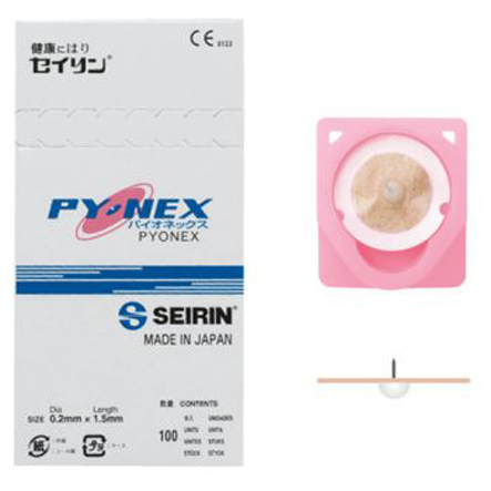 Akupunkturní jehly Seirin Pyonex / 0,2×1,5 mm. Pro připevňovací náplast je použita vysoce propustná mikroporézní hmota. Páska je odolná vůči potu a mechanickému namáhání. Aplikace Pyonexu je pro pacienta pohodlné. Pyonex je aplikován bez dotyku hrotu jehly nebo pásky. Balení 100 kusů.