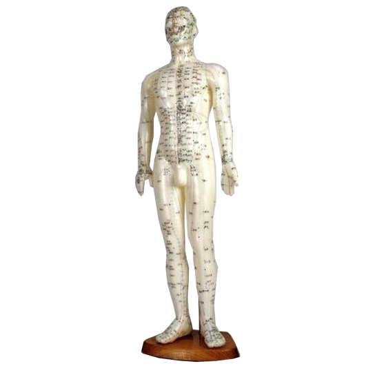 Akupunkturní model muže na dřevěném podstavci. Model o velikosti 60 cm je umístěný na dřevěném podstavci je určen jako názorná pomůcka pro lokalizaci akupunkturních bodů drah (meridiánů). Jednotlivé akupunkturní dráhy jsou barevně odlišené a body jsou označeny dle číselníku WHO.