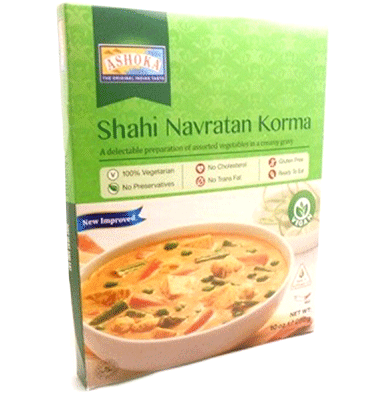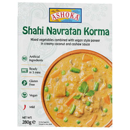 Různé druhy zeleniny v husté ořechové omáčce. Navratan znamená devět drahokamů a korma je v překladu kari. Je to typické severoindické jídlo, které můžeš servírovat s chlebem nebo rýží. Vhodné pro vegany. Hotové jídlo veganské, bezlepkové,
