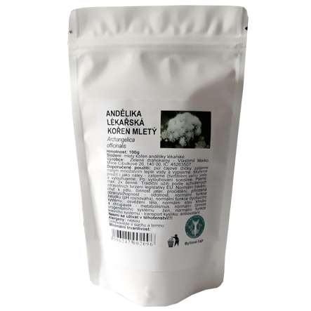 Jemně mletý kořen anděliky lékařské - Archangelica officinalis. Andělika přispívá imunitnímu systému, pomáhá s trávením, se zažíváním a střevními funkcemi, přispívá zdraví jater, reguluje chuť k jídlu. Bylinné čaje.
