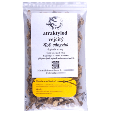 Atraktylod vejčitý (Atractylodis ovatae) oddenek bylinný čaj 50g. Denní dávka 3g. Připravte si cca 1/4 litru vody na vývar a přidejte odměřené množství. Vařte asi 5 - 10 minut na mírném ohni. Vývar s kousky je možno přidávat do jídel čínského charakteru.