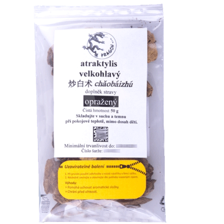 Atraktylod velkohlavý Chaobaizhu opražený 50g - Atractylodis macrocephalae rhizoma praep. Bylinný čaj. Způsob přípravy: Připravte si cca 1/4 litru vody na vývar a přidejte odměřené množství. Vařte asi 5 - 10 minut na mírném ohni. Vývar s kousky je možno přidávat do jídel čínského charakteru.