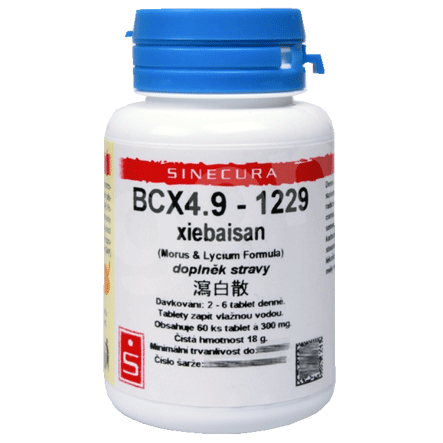 BCX4.9-1229 xiebaisan (tablety) je bylinná směs klasického složení ve formě tablet. V balení 60 tablet á 300 mg. Dávkování 2-6 tablet denně. Složení: moruše kůra kořenů, kustovnice kůra kořenů, lofater nať, lékořice kořen, rýže semeno
