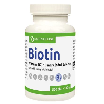 Doplněk stravy s obsahem vitamínu biotinu v tabletách.