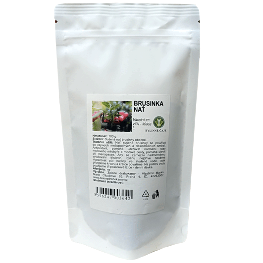 Surovina pro přípravu bylinného čaje – nálevu, Brusinka obecná má podobné vlastnosti jako medvědice lékařská, tj. pomáhá jako močové desinficiens, má svíravé účinky. Bylinný čaj. Doporučené použití: necháme máčet ve studené vodě, po 8 hodinách přivedeme k varu a necháme jen několik sekund povařit. Pak ještě louhujeme, než je čaj teplý - připravený k pití.