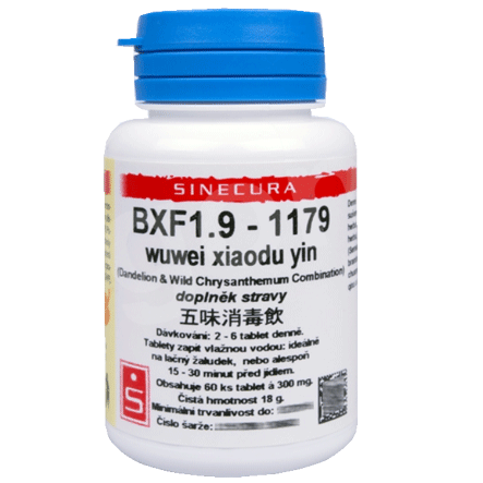 wu wei xiao du yin - 60 tablet. Složení: smetánka, zlateň, violka, zimozel, polorlíček. Pojiva: Stearan hořečnatý, bramborový škrob. Balení obsahuje 60 ks tablet á 300 mg. Každá tableta Sinecura odpovídá cca 1,5 g směsi zdrojových (sušených) bylinek. Koncentrace 5 : 1.