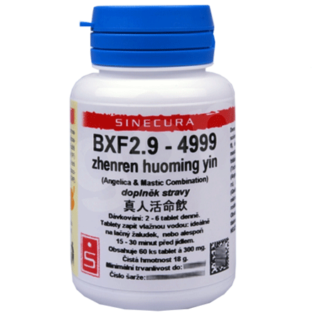 Zhenren huoming yin - Balení obsahuje 60 ks tablet á 300 mg. Každá tableta Sinecura odpovídá cca 1,5 g směsi zdrojových (sušených) bylinek. Koncentrace 5 : 1. Složení: zimolez, děhel, pryskyřice mastixová, lékořice, fritilárie, okurkovec, citroník, děhel, ledebouriela, pryskyřice myrrhová, dřezovec.