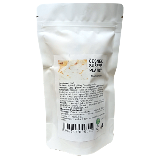 Šetrně sušené velké plátky česneku, které si zachovávají neobyčejně silnou chuť a neodolatelné aroma. Česnek sušený používáme všude tam, kde čerstvý. Do polévek, omáček, luštěnin, masa a zeleniny, pomazánek, atd.