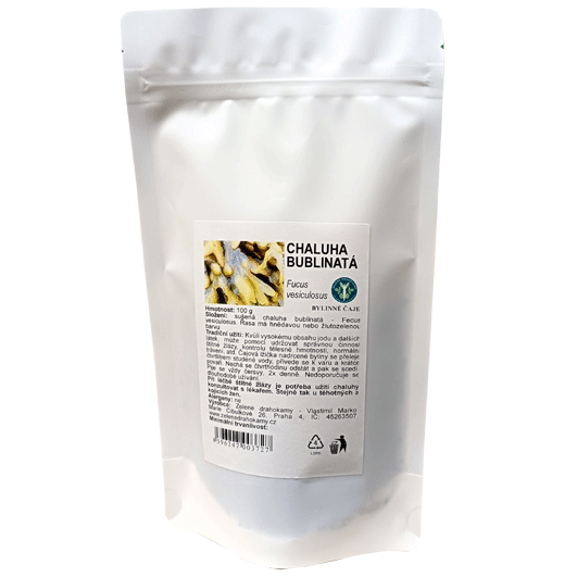 Chaluha bublinatá (Fucus vesiculosus, čeleď chaluhovité - Fucaceae, SK: Chaluha bublinatá) Přispívá k dobré činnosti štítné žlázy při nedostatku jódu (hypofunkce), ke zrychlení metabolismu. Dále obsahuje i významné množství minerálů, vitamínů a stopových prvků. Ovlivňuje i ostatní žlázy s vnitřní sekrecí.