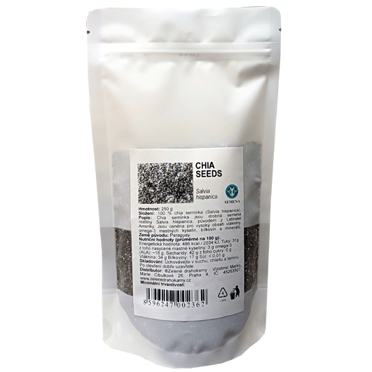 Popis: Chia semínka jsou drobná semena rostliny Salvia hispanica, původem z Latinské Ameriky. Jsou ceněna pro vysoký obsah vlákniny, omega-3 mastných kyselin, bílkovin a minerálů.