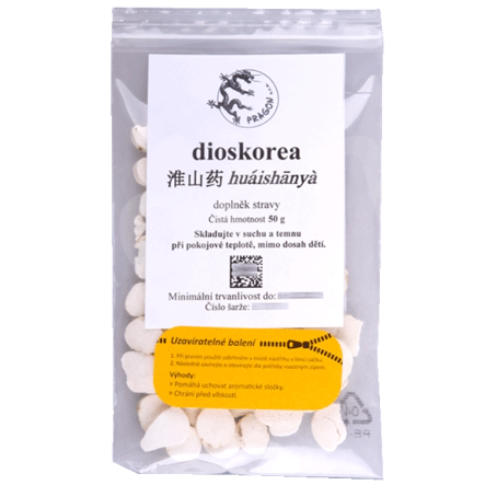 Balení obsahuje 50 g dioskora, huaishanyao, Dioscoreae rhizoma. V Číně se užívá mnoho prostředků a přípravků, jejichž použití a způsob přípravy nejsou u nás zatím zcela běžné. Jedním z nich jsou i tyto oddenky. Nelze je konzumovat jako základní potravinu, ale pouze jako potravinu doplňkovou.
