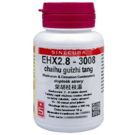 Chaihu guizhi tang - 60 bylinných tablet. Složení: Prorostlík, šišák, všehoj, skořicovník, pivoňka, zázvor, lékořice, pinélie, jujuba. Vyrobeno podle tradiční receptury chaihu guizhi tang. Každá tableta Sinecura odpovídá cca 1,5 g směsi zdrojových (sušených) bylinek. Koncentrace 5 : 1.