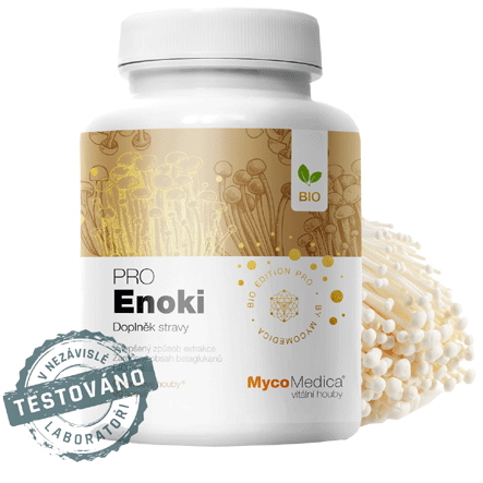 Enoki (penízovka sametonohá, Flammulina velutipes) je po celém světě hojně využívaná pro vysoký obsah bioaktivních látek. Ve starém Egyptě byla nazývána houbou nesmrtelnosti. Extrakty Enoki PRO BIO od Mycomedicy obsahují ještě více betaglukanů – nejúčinnějších látek podporujících obranyschopnost našeho těla. Díky unikátní kombinované extrakci, kterou MycoMedica vyvinula, se z hub uvolňuje ještě více betaglukanů. Zároveň zůstává zachován optimální poměr ostatních účinných látek, čímž se tyto extrakty co nejvíce přibližují původní houbě, jak ji příroda stvořila. A to vše v certifikované BIO kvalitě, bez jakýchkoliv přídatných látek. Užíváte pouze čistou, kvalitní a účinnou houbu.