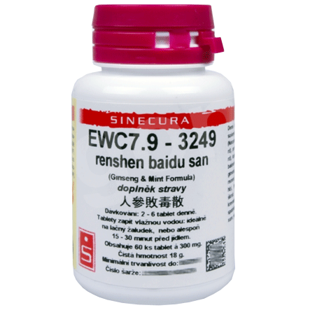Renshen baidu san - bylinné složení: notopterygium, děhel, prorostlík, smolník, koprníček, citroník, balónovník, žen-šen, pórnatka, zázvor, lékořice, máta. Balení obsahuje 60 ks tablet á 300 mg. Každá tableta Sinecura odpovídá cca 1,5 g směsi zdrojových (sušených) bylinek. Koncentrace 5 : 1. Doplněk stravy