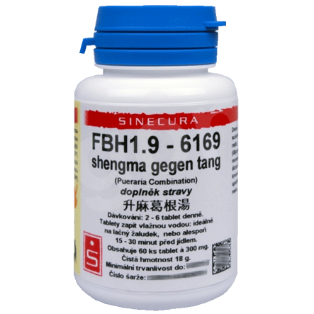FBH1.9 - shengma gegen tang - pian/tablety. Složení: puerárie, pivoňka, lékořice, zázvor. Vyrobeno podle staré receptury shengma gegen tang. Balení obsahuje 60 ks tablet, každá tableta odpovídá cca 1,5 g směsi zdrojových (sušených) bylinek. Koncentrace 5 : 1.