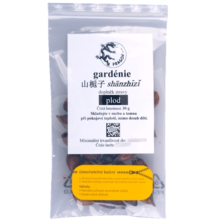Gardénie Shanzhizi plod 30g. Připravte si cca 1/4 litru vody na vývar a přidejte odměřené množství. Vařte asi 5 - 10 minut na mírném ohni. Vývar i s kousky je možno přidávat do jídel čínského charakteru. Bylinné čaje.