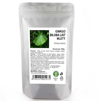 Jemně mletý list Ginkga Biloby - Jinanu dvoulaločného. Surovina pro přípravu bylinného čaje - 100g. Jedná se o jednu z nejstarších rostlin naší planety. Antioxidant, pomáhá s duševním a fyzickým zdravím, podporuje paměť. Bylinný čaj