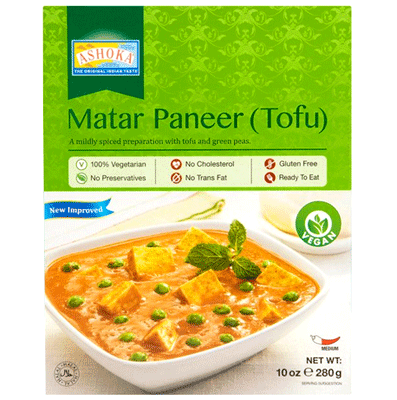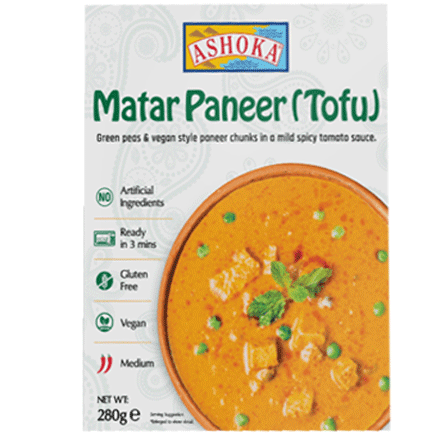 Jemně pikantní hotové karí z čerstvého zeleného hrášku v rajčatové omáíčce s indickým domácím sýrem paneer TOFU. Hotové jídlo bezlepkové, bez laktózy, bez alergenů, bez přídatných látek, bez přidaného cukru, bez umělých aromat a příchutí, veganské.