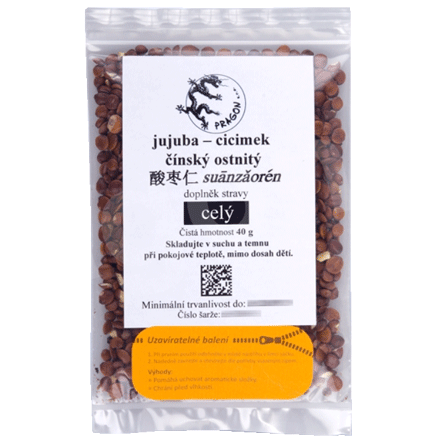Balení obsahuje 40 g Jujuby – cicimku čínského ostnitého celého, suanzaoren, ziziphi spinosae semen. V Číně se užívá ve stravě mnoho prostředků a přípravků, jejichž použití a způsob přípravy nejsou u nás zatím zcela běžné. Jedním z nich je i tento, nelze ho konzumovat jako základní potravinu, ale pouze jako potravinu doplňkovou.