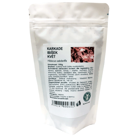 Karkadé jsou sušené kalichy ibišku súdánského, označované jako květ. Čaj z ibišku je vínově červené barvy, kyselé chuti. Vhodný do čajových směsí, kterým dává příjemnou kyselou chuť a barvu, ale i jako samotný čaj. 100g balení - řez - bylinný čaj