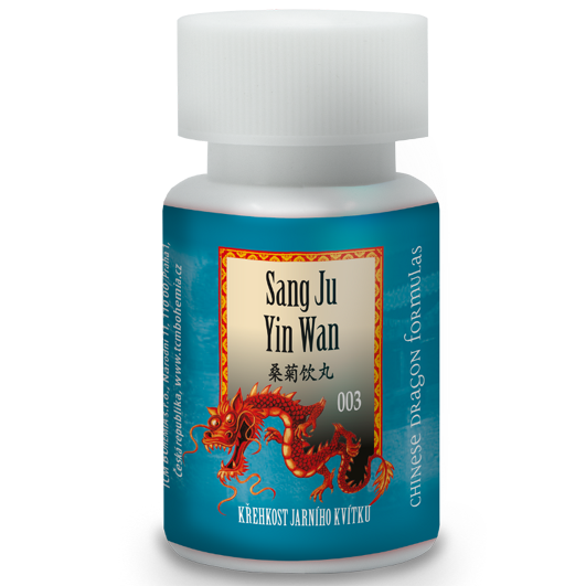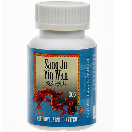 0,99g – LU GEN – Rákos obecný, oddenek, 0,55g – JIE GENG – Platykodon velkokvětý, kořen, 0,55g – JU HUA – Zlateň morušolistá, květ, 0,55g – LIAN QIAO – Zlatice převislá, plod, 0,55g – SANG YE – Morušovník bílý, listy, 0,36g – XING REN – Meruňka obecná, semeno, 0,20g – BO HE – Máta jednokališná, nať, 0,21g – SHENG GAN CAO – Lékořice uralská, kořen. Ostatní složky kukuřičný škrob, rýžový škrob, leštící látka talek.