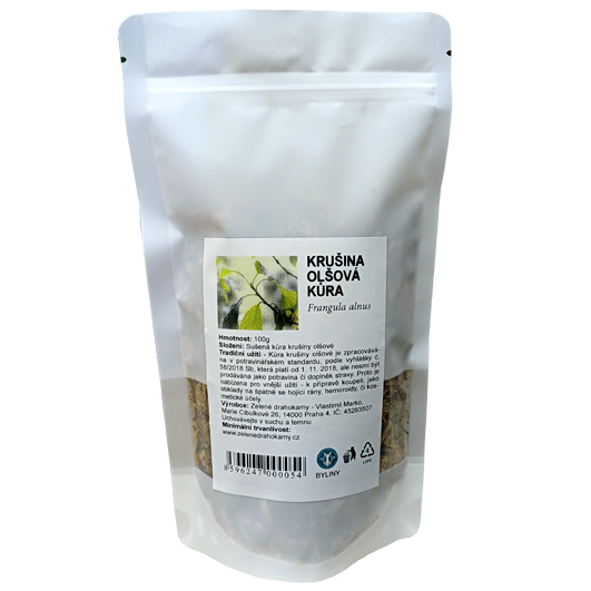 Krušina olšová 100g řezaná. Podle vyhlášky č. 58/2018 Sb, která platí od 1. 11. 2018, nesmí být prodávána jako potravina ani doplněk stravy. Proto je nabízena jen pro vnější užití - k přípravě koupelí, jako obklady na špatně se hojící rány, hemoroidy, či kosmetické účely.