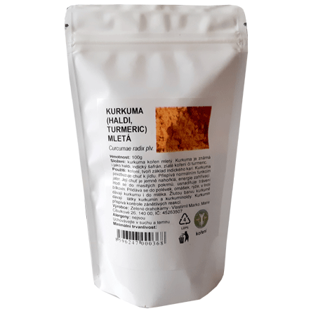 Kurkuma, indický šafrán, Haldi, Turmerik má velmi specifickou dřevitou vůni a chuť. Je to koření z mletého sušeného oddenku kurkumovníku dlouhého. Je základem směsí pro kari koření. Můžete ho použít do zeleninových i masitých pokrmů, k drůběži i rybě, do rizota apod. Barví silně na žluto.