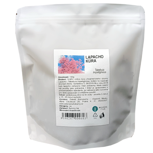 Řezaná kůra. Lapacho je strom, který roste v Amazonii na území Brazílie, Peru, Bolívie, Paraguaye, Argentiny. Bylinný čaj. Dle vyhlášky č. 58/2018 Sb je v ČR nabízena jen pro zevní použití, i když má řadu schválených zdravotních tvrzení (seznam OnHold).