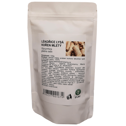 Lékořice lysá - Glycyrrhiza glabra velmi jemně namletá, rozpustná ve vodě. Lékořice je tradiční bylinou, kterou vzpomíná už první čínský atlas rostlin z období před 5000 lety. Lékořice lysá je typická svojí sladkou chutí, kterou většina z nás zná jako pendrek. Černý pendrek, prodávaný v obchodech není čistou lékořicí, ale směsí několika koření, např. anýzu. Lékořice je 50x sladší než řepný cukr a také je díky tomu se mu na východě přezdívá sladké dřevo. Hodí se výborně do směsí, jelikož maskuje leckdy nepříjemnou chuť některých bylin.