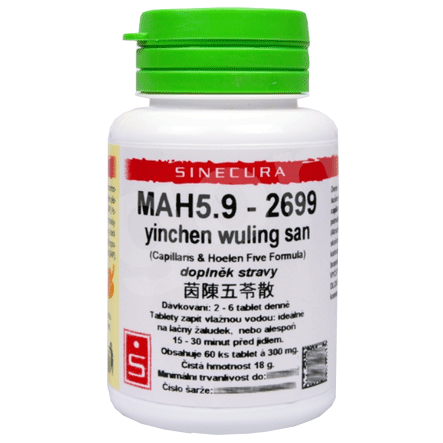 Spojení dvou dílu pelyňku yinchenhao a jednoho dílu tradiční směsi wulingsan. Bylinná směs klasického složení ve formě tablet. V balení 60 tablet á 300 mg. Dávkování 2-6 tablet denně.