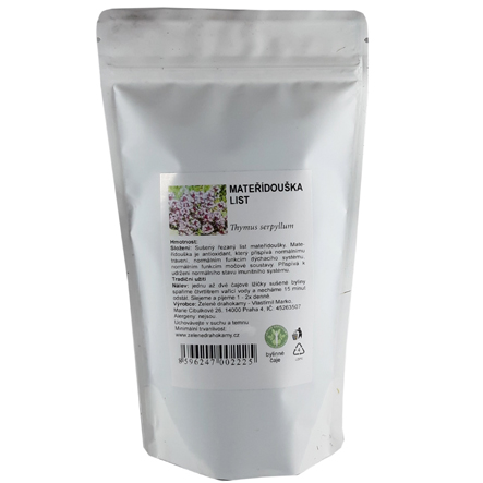 Složení: Sušený řezaný list mateřídoušky. Mateřídouška je antioxidant, který přispívá normálnímu trávení, normálním funkcím dýchacího systému, normálním funkcím močové soustavy. Přispívá k udržení normálního stavu imunitního systému.