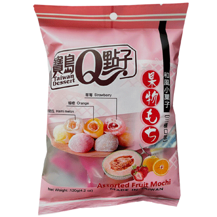 Každá mochi je samostatně zabalena v balíčku. Balení obsahuje tři příchutě: jahoda, pomeranč a meloun. Mochi jsou japonské rýžové koláčky z lepkavé rýže. Jde o tradiční pokrm, který se podává při oslavách japonského nového roku.