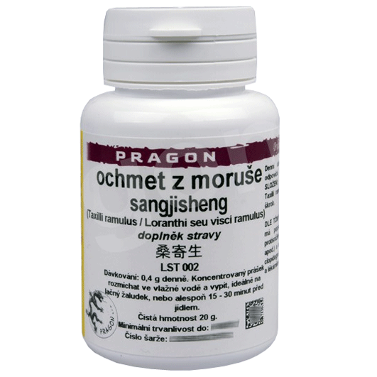 Ochmet z moruše Sangjisheng bylinný instantní prášek 20g Sinecura. Koncentrace 5 : 1, 1 g prášku odpovídá cca 5 g sušených bylinek, 1 balení odpovídá cca 100 g sušených bylinek. Bylinný doplněk stravy