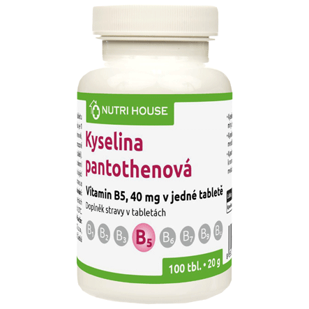 Vitamínu kyselina pantothenová 40 mg v tabletách. Kyselina pantothenová ovlivňuje především metabolismus tuků a cholesterolu. Nedostatek poškozuje nervový systém, kůži, krvetvorbu, játra a nadledviny. Často se používá ke zvýšení sportovního výkonu. Doplněk stravy 100 tablet