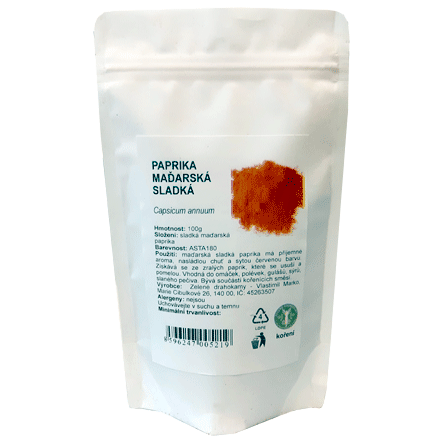 Paprika sladká maďarská, barevnost ASTA160. Sladká, jemně mletá paprika, s příjemným aroma, nasládlou chutí, a sytě červenou barvou. Vhodná do polévek, salátů, gulášů, sýrů, slaného pečiva atd.