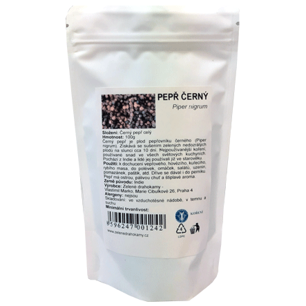 Pepř černý celý. Plody pepřovníku černého (Piper nigrum). Černý pepř je nejrozšířenějším kořením na světě, používaný snad ve všech světových kuchyních. Lidé jej používali již ve starověku. Pepř má ostrou, pálivou chuť, štiplavé aroma.