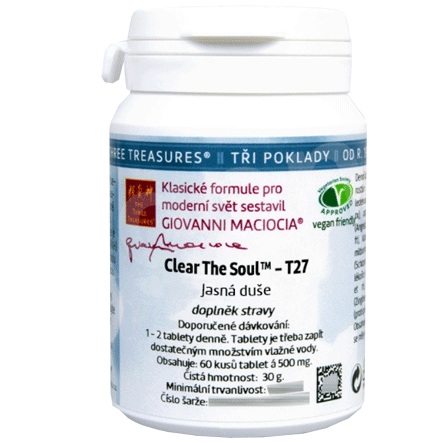 Jasná duše - bylinná směs z řady Tří podkladů (The Three Treasures) sestavená Giovannim Maciociou ve formě tablet. V balení 60 tablet á 500 mg, dávkování 1-2 tablety denně. Doplněk stravy.