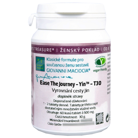 T30 - Vyrovnání cesty Jin (Ease the Yourney - Yin) (tablety). Prodejní balení obsahuje 60 ks tablet. Bylinná směs z řady Ženský poklad (Women´s Treasure) při jejíž sestavování myslel Maciocio mimo jiné i na ženy v menopauze. Podle TČM pročistí prázdnou horkost a vyživuje jin ledvin a esenci.