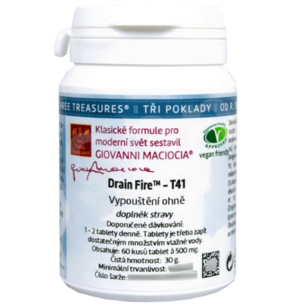 T41 - Vypuštění ohně (Drain Fire) (tablety). Bylinná směs z řady Tří podkladů sestavená Giovannim Maciociou ve formě tablet. V balení 60 tablet á 500 mg, dávkování 1-2 tablety denně. Charakteristika účinků dle čínské dietetiky: pročištění horkosti jater a srdce, vysušení vlhkosti, utišení mysli