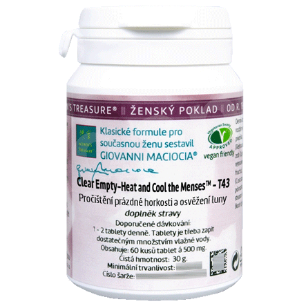 T43 - Pročištění prázdné horkosti a osvěžení luny (Clear Empty-H. Bylinná směs z řady Ženský poklad (Women´s Treasure) sestavená Giovannim Maciociou ve formě tablet. V balení je 60 tablet á 500 mg, dávkování je 1-2 tablety denně.