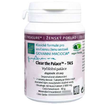T45 - Vyčištění paláce (Clear the Palace) (tablety). Bylinná směs z řady Ženský poklad (Women´s Treasure) sestavená Giovannim Maciociou ve formě tablet. V balení je 60 tablet á 500 mg, dávkování je 1-2 tablety denně. Charakteristika účinků dle čínské dietetiky: přeměna hlenů, vyživení esence