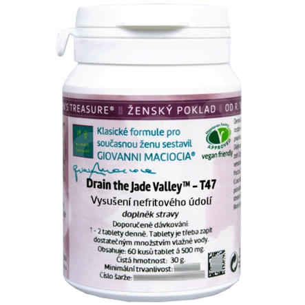 T47 - Vysušení nefritového údolí (Drain the Jade Valley) (tablet. Bylinná směs z řady Ženský poklad (Women´s Treasure) sestavená Giovannim Maciociou ve formě tablet. V balení je 60 tablet á 500 mg. Charakteristika účinků dle čínské dietetiky: vysušení vlhkosti, zabití parazitů.