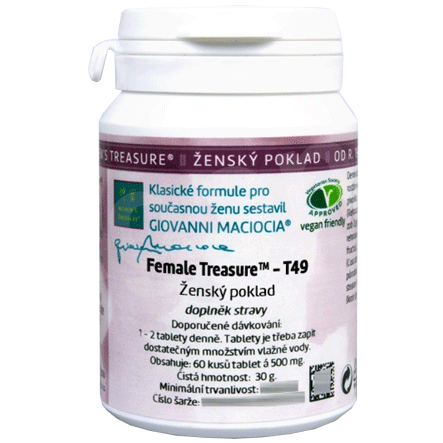 T49 - Ženský poklad (Female Treasure) (tablety). Bylinná směs z řady Ženský poklad sestavená Giovannim Maciociou ve formě tablet. V balení je 60 tablet á 500 mg, dávkování je 1-2 tablety denně. Charakteristika účinků dle čínské dietetiky: vyživení jin ledvin a jater, ponoření jangu jater
