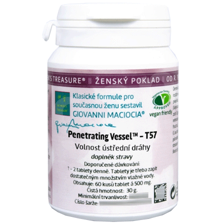 T57 - Volnost ústřední dráhy (Penetrating Vessel) (tablety). Bylinná směs z řady Ženský poklad (Women´s Treasure) sestavená Giovannim Maciociou ve formě tablet. V balení je 60 tablet á 500 mg. Charakteristika účinků dle čínské dietetiky: posílení řídící a ústřední dráhy, napravení protisměrné čchi.