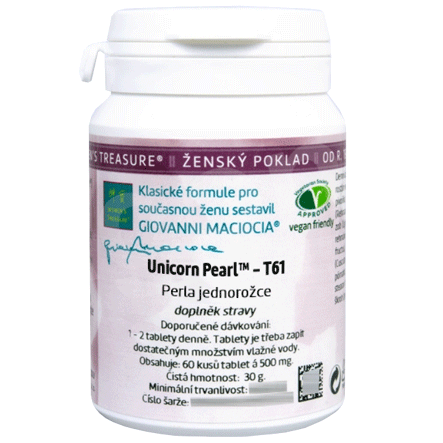 T61 - Perla jednorožce (Unicorn Pearl) (tablety). Balení obsahuje 60 tablet á 500 mg. Balení á 60 tablet odpovídá 225 g zdrojových bylin. Každá tableta odpovídá 3,75 g zdrojových (sušených) bylinek. Koncentrace 7,5 : 1. Bylinná směs z řady Ženský poklad (Woman's Treasure) sestavená Giovannim Maciociou ve formě tablet.