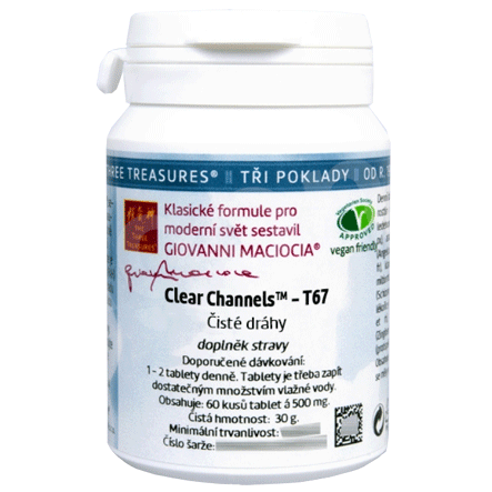 T67 - Čisté dráhy (Clear Channels) (tablety). Bylinná směs z řady Tří podkladů (The Three Treasures) sestavená Giovannim Maciociou ve formě tablet. V balení 60 tablet á 500 mg, dávkování 1-2 tablety denně. Charakteristika účinků dle čínské dietetiky: vyloučení vlhké horkosti z kloubů