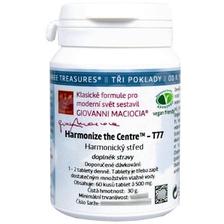 T77 - Harmonický střed (Harmonize the Centre) (tablety). Bylinná směs z řady Tří podkladů (The Three Treasures) sestavená Giovannim Maciociou ve formě tablet. Charakteristika účinků dle čínské dietetiky: doplnění čchi a jin žaludku a sleziny, přeměna hlenů,oživení krve.