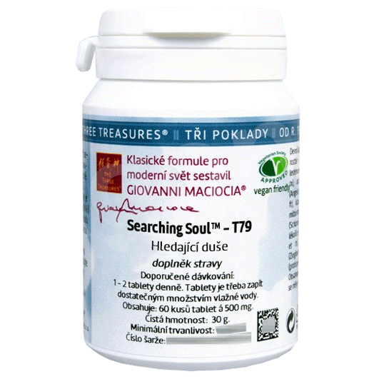 T79 - Hledající duše (Searching Soul) (tablety). Bylinná směs z řady Tří podkladů (The Three Treasures) sestavená Giovannim Maciociou ve formě tablet. Charakteristika účinků dle čínské dietetiky: doplnění jangu ledvin, vyživení krve, podpora hun a vůle. Bylinné složení: kozinec, děhel, rdesno, vítod, albície, kurkuma, růže, citroník, všehoj, štětka, lékořice, jujuba, pšenice hladká