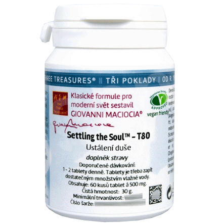 T80 - Ustálená duše (Settling the Soul) (tablety). Bylinná směs z řady Tří podkladů (The Three Treasures) sestavená Giovannim Maciociou ve formě tablet. Charakteristika účinků dle čínské dietetiky: odvedení ohně, otevření otvorů a tišení mysli, přeměna hlenů. Bylinné složení: vítod, puškvorec, šišák, hořec, lofater, jujuba, okurkovec, unkárie, lotos, pivoňka, bambus, citroník, lékořice
