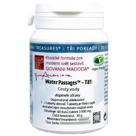 T81 - Cesty vody (Water Passages) (tablety). Bylinná směs z řady Tří podkladů (The Three Treasures) sestavená Giovannim Maciociou ve formě tablet. Charakteristika účinků dle čínské dietetiky: přeměna vlhkosti a pročištění horkosti v měchýři, doplnění ledvin.